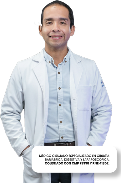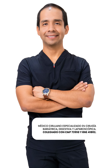 Cirujano bariátrico, digestivo y laparoscópico con colegiatura activa: CMP 73998 | RNE 41802. Amplia experiencia en cirugías de alta complejidad con resultados comprobados.