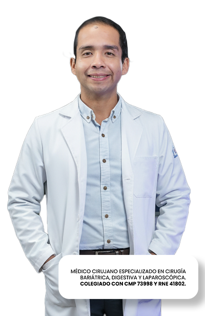 Cirujano bariátrico, digestivo y laparoscópico con colegiatura activa: CMP 73998 | RNE 41802. Amplia experiencia en cirugías de alta complejidad con resultados comprobados.
